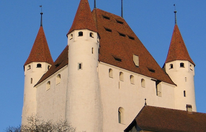 Mächtig und erhaben thront das Schloss über der Stadt Thun. Der imposante Donjon, der die Gesamt anlage dominiert, stammt aus der Zeit um 1200. Das Bauwerk wurde von Berchtold V. in Auftrag gegeben und ist ein einzigartig erhaltener Zeuge der Bau kunst der