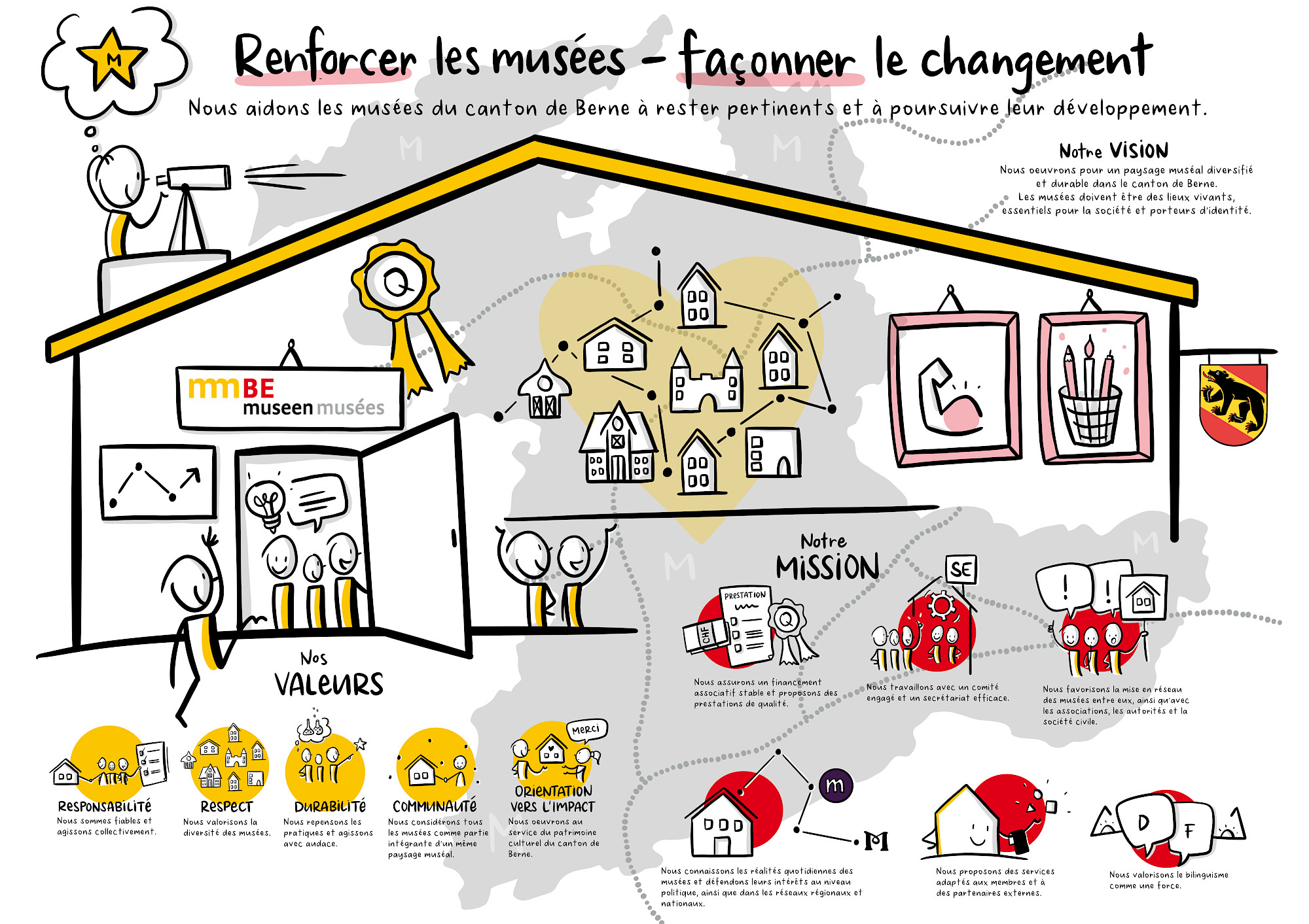 mmBE est le pôle de savoir et d’information dédié aux musées dans le canton de Berne. Elle favorise la mise en réseau entre les musées et avec les associations, les autorités et la société. À travers des prestations et des projets variés, mmBE soutient ses membres et s’adresse également au public. Sur le plan politique ainsi que dans les réseaux régionaux et nationaux, elle représente les intérêts de ses membres.