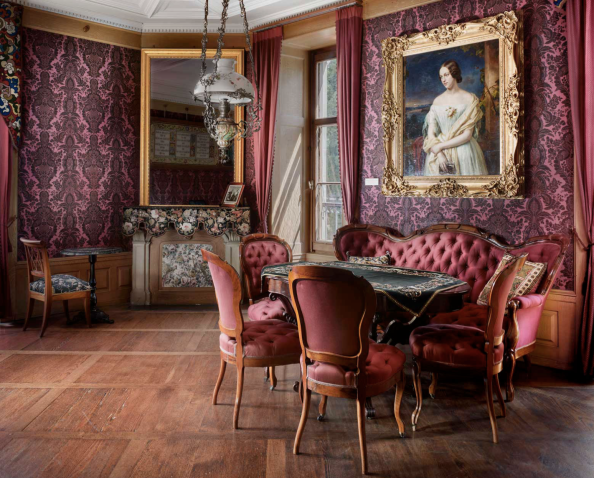 In den letzten Jahren wurden die ehemals herrschaftlichen Räume im 1. Obergeschoss sorgfältig restauriert. Darunter befindet sich ein Badezimmer aus dem Jahr 1904, dessen Ausführung die damalige Schlossbesitzerin Helene Harrach in Auftrag gegeben hat. Zugänglich ist weiter das als «Chambre d’honneur» bezeichnete Gästezimmer und ein für die Begleitung der Gäste vorgesehenes Bedienstetenzimmer. Im offenen Raum vor den Zimmern befindet sich ein Billardtisch, der zum Zeitvertreib einlud. Die Inszenierungen vermitteln Einblicke in das Leben der Grafenfamilie, die bis in die 1920er Jahre jeweils die Sommermonate am Thunersee verbrachte. Der Billardtisch darf während den Öffnungszeiten auch von den Schlossgästen benutzt werden! Dauerausstellung im 1. OG, Ost