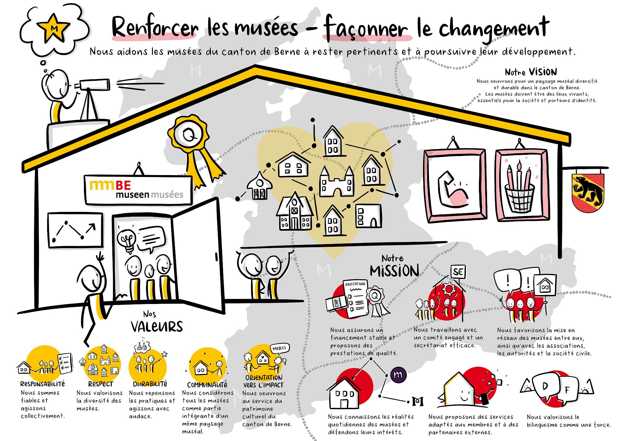 Fondée en 2001, mmBE est l’association des musées du canton de Berne. En tant qu’association régionale, elle renforce la diversité et la capacité d’avenir du paysage muséal cantonal et soutient les musées dans leur rôle de lieux culturels créateurs d’identité, vivants et socialement pertinents. Ses membres institutionnels regroupent principalement des musées locaux, régionaux et spécialisés de petite et moyenne taille, ainsi que des musées plus importants situés dans les centres urbains. Les personnes privées peuvent également être membres de l’association.